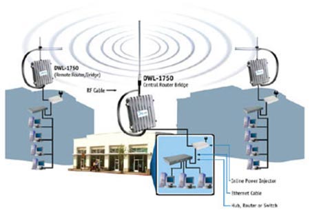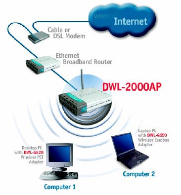 Для обеспечения беспроводным пользователям доступа к корпоративным базам данных или разделяемым ресурсам - серверам и принтерам, вы можете установить точку доступа. Это устройство позволяет взаимодействовать беспроводным рабочим станциям с уже существующей сетью Ethernet. Точки доступа компании D-Link совместимы с протоколом Wi-Fi и прозрачно интегрируются с вашей сетью Ethernet.
