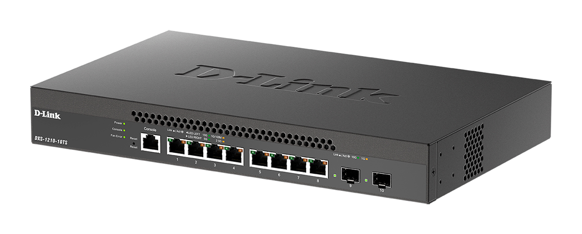 Управляемый L2+ коммутатор DXS-1210-10TS, оснащенный 8 портами 10GBase-T и 2 портами 10GBase-X SFP+, осуществляет коммутацию трафика на скорости до 10 Гбит/с и предназначен для использования в сетях предприятий малого и среднего бизнеса. За счет высокой производительности данный коммутатор позволяет использовать такие услуги, как облачные сервисы, виртуализация, а также приложения server-to-server. DXS-1210-10TS является экономически выгодным решением для организации сетей 10 Gigabit Ethernet.