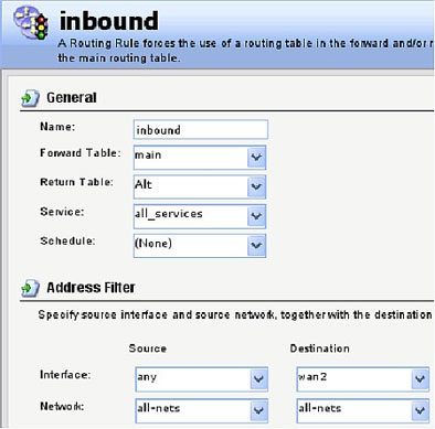 See reegel näitab seadmele, et ftp võrguliiklus (service), mis toimub sisemisest lan-võrgust välisesse võrku läbi esimese teenusepakkuja (wan1), suunatakse marsruutimise alternatiivsesse tabelisse, kus põhilülituseks on wan2 (teine teenusepakkuja). Tulemusena suunatakse kogu ftp võrguliiklus läbi teise teenusepakkuja. Teise teenusepakkuja mitteligipääsetavuse korral käivitub teine marsruut alternatiivses tabelis ja ftp võrguliiklus toimub läbi esimese teenusepakkuja