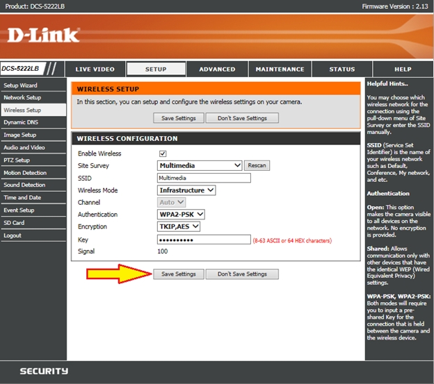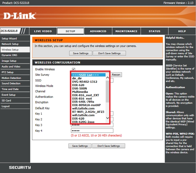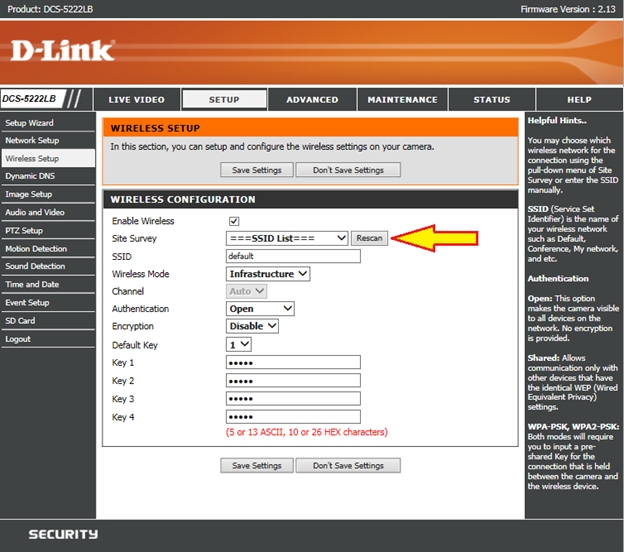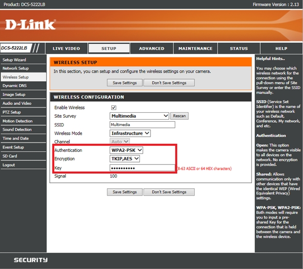 Шаг 7: Если в беспроводной сети, к которой Вы подключаете камеру, используется шифрование данных, необходимо выбрать соответствующий тип шифрования в поле Authentication (Аутентификация). Ниже в поле Key (Ключ) введите пароль к выбранной Wi-Fi-сети.