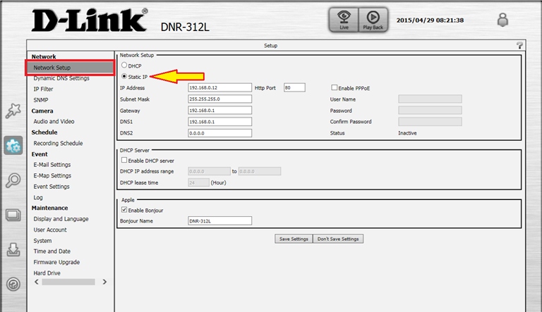 Шаг 4: Выберите раздел Network Setup (Установка сети) в меню слева и нажмите "Static IP" (Статический IP-адрес).