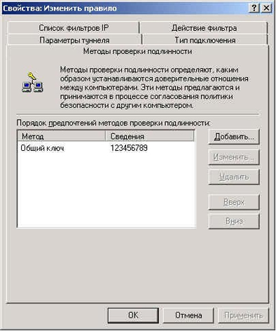 Переходим на закладку Методы проверки подлинности. Добавляем новый метод проверки безопасности. В появившемся окне выбираем Использовать данную строку для защиты обмена ключами и вводим наш секретный ключ '123456789'. ОК. В списке методов предпочтений оставляем только наш созданный ключ остальные удаляем.
