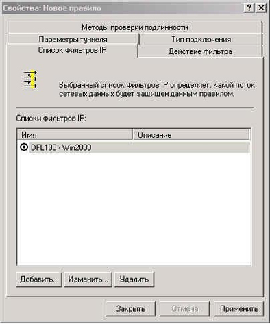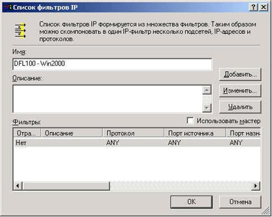 В списке фильтров нажимаем кнопку Добавить (избегаем использование всевозможных мастеров). В появившемся окне вводим имя фильтра DFL100 - Win2000