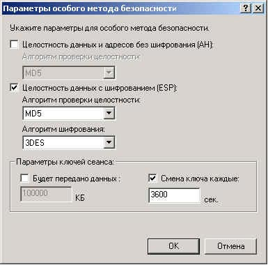 Еще в свойствах созданной политики безопасности IP нам будет интересна закладка Общие и кнопка на ней Дополнительно. В открывшемся окне настраиваются параметры работы IKE (первой фазы IPSec). Проверять подлинность и создавать новый ключ через каждые 480 мин. (28800 сек.). Кнопка Методы открывает окно редактирования параметров шифрования и аутентификации IKE. Необходимый нам метод 3DES,MD5, средняя группа (1024 bit) уже создан.