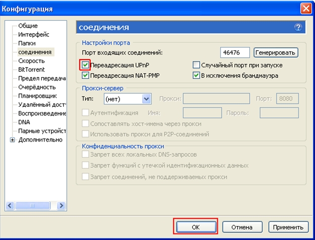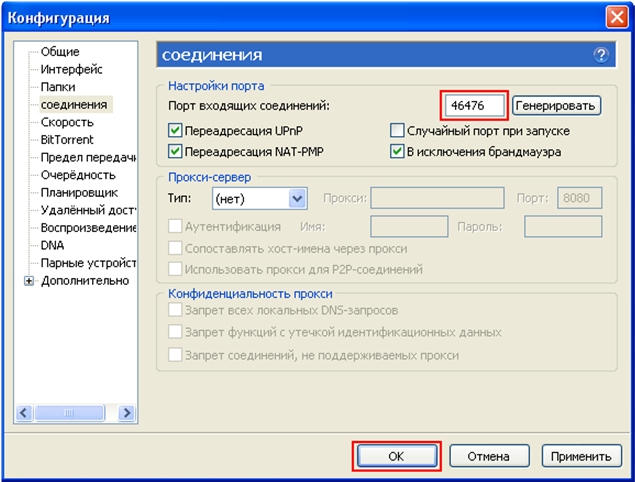 В настройках uTorrent задайте тот же порт для входящих соединений и нажмите «ОК».