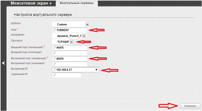 В открывшемся окне задайте имя правила, протокол TCP/UDP, порт, через который будет проходить трафик торрент-клиента и IP-адрес Вашего компьютера в сети.