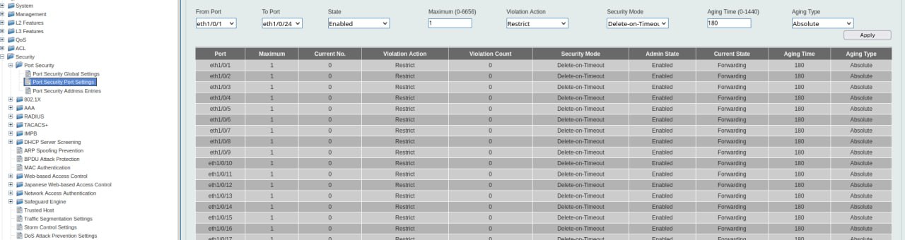 Вопрос: Пример настройки Port Security через Web-интерфейс