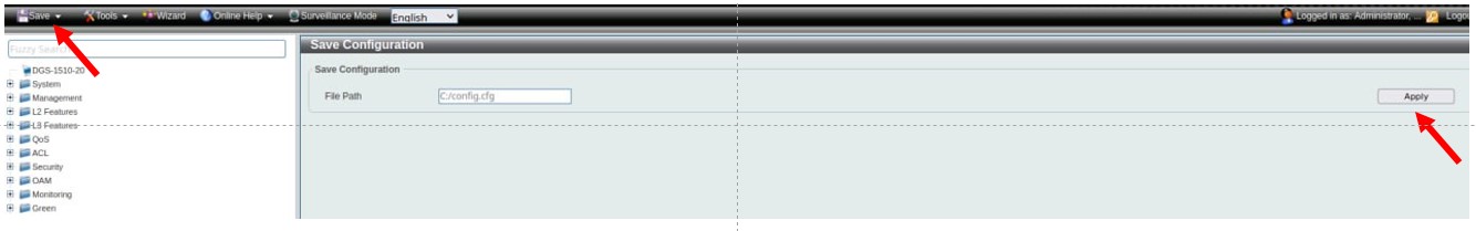 8. Чтобы сохранить выполненные настройки, в левом верхнем углу нажмите Save, выберите Save Configuration и нажмите Apply.