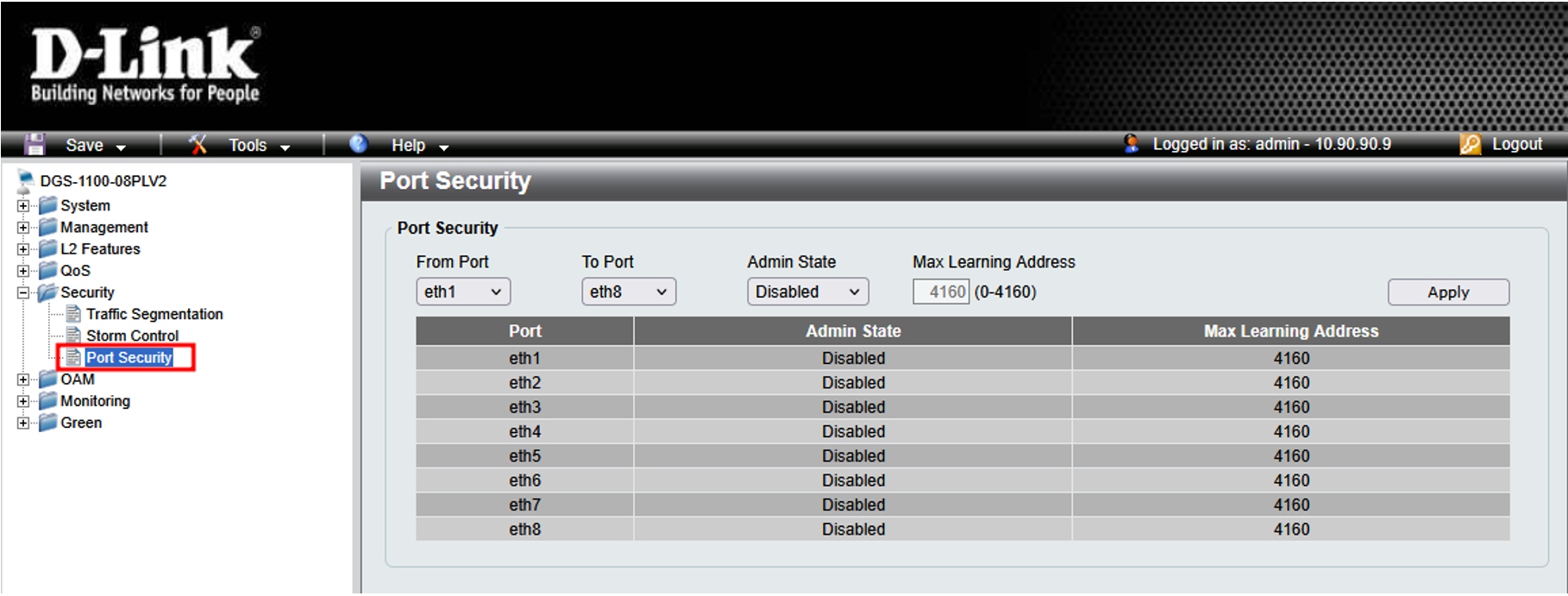 - В Web-интерфейсе коммутатора в меню слева выберите Security → Port Security и укажите диапазон портов, для которых необходимо активировать функционал Port Security, выбрав соответствующие значения в полях From Port и To Port.