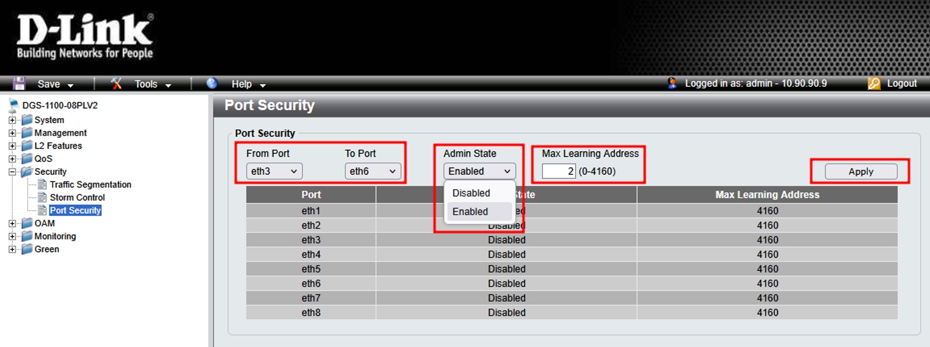 - В списке Admin State выберите Enabled для того, чтобы включить защиту, заблокировать порт и связанную с ним таблицу MAC-адресов.