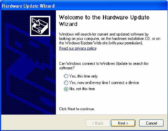 Проверьте, что поставщик драйвера Microsoft. Нажмите кнопку "Обновить драйвер", для того чтобы начать переустановку драйвера. Появится экран показанный ниже. Выберите "Нет, позже" и нажмите "Далее".
