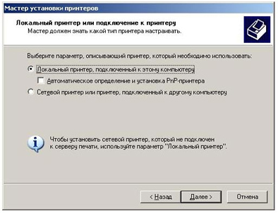 5. Поставьте переключатель на «Локальный принтер, подключенный к этому компьютеру» и снимите галочку «Автоматическое определение и установка PnP-принтера», нажмите Далее