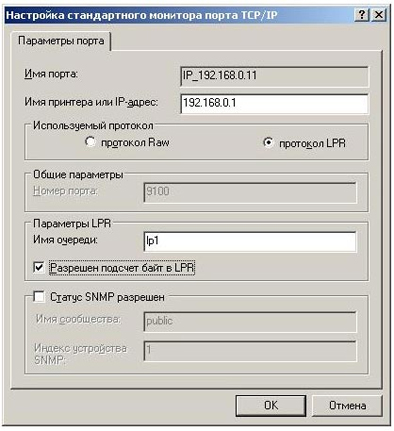 13. В поле Используемый протокол выберите протокол LPR. В поле Имя очереди введите lp1 (Первая буква – это маленькая L, а не большая i), поставьте галочку Разрешен подсчет байт в LPR