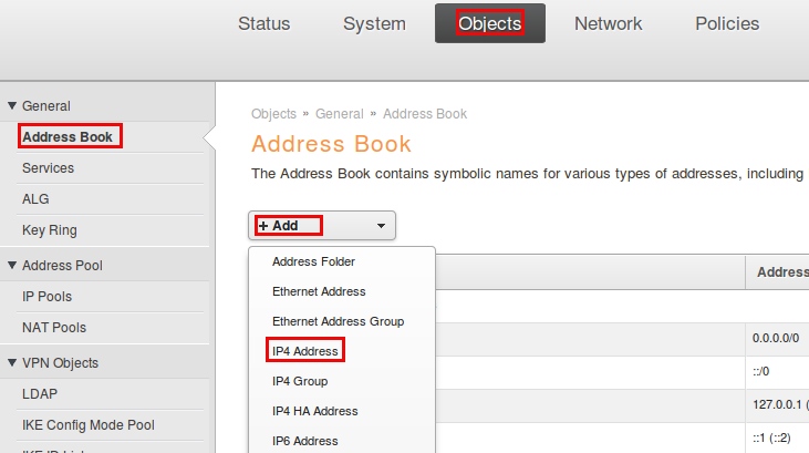 Пройдите в Web интерфейсе Objects → Address book, нажмите кнопку Add, из выпадающего меню выберите IP4 Address.