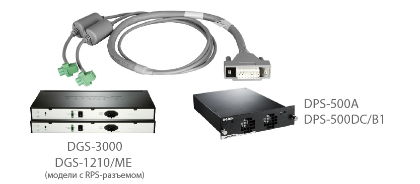(Для подключения резервного источника DPS-500A или DPS-500DC/B1 к коммутаторам серий DGS-3000-xx и DGS-1210-xx/ME с RPS-разъемом)