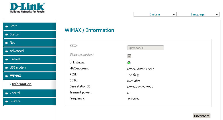 3. Atverskite kairėje esančio meniu punktą „WiMAX“ ir „Information“. Laukelyje SSID įveskite „@mezon.lt“ (be kabučių). Jei MEZON modemas prijungtas, laukas yra neaktyvus. Atjunkite MEZON modemą arba spauskite „Disconnect“. Suvedus SSID, spauskite „Connect“.