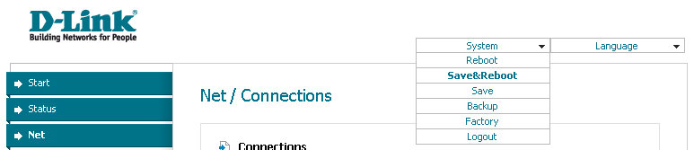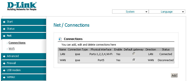 4. Atverskite kairėje esančio meniu punktą „Net“ ir „Connections“. Paspauskite ant įrašo „WAN“ (paveikslėlyje antras įrašas).