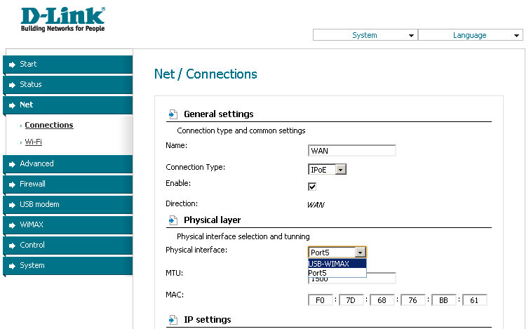 5. Atsivertusiame lange pakeiskite „Physical interface:“ parametrą iš „Port5“ į „USB-WIMAX“. Išsaugokite pakeitimus.