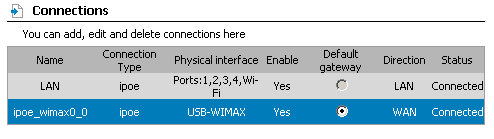 6. „Connections“ turėtų atrodyti sekančiai (jei Status yra „Connected“, vadinasi internetas turi būti prieinamas):