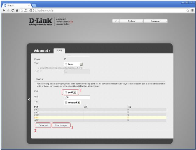 Atsidariusiame lange pasirinkite prievadą, prie kurio bus jungiamas GALA priedėlis/televizorius ir jį ištrinkite iš šios grupės. Paspauskite mygtuką Save changes. Žemiau esančiame pavyzdyje pasirinktas 4 prievadas.