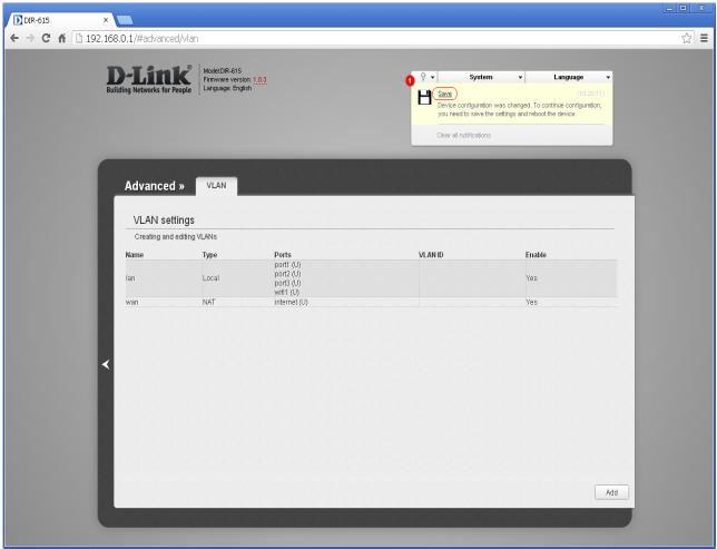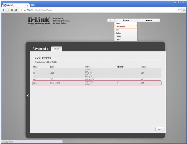 Išsaugokite nustatymus ir perkraukite įrenginį (System >> Save&Reboot). Sėkmingai sukonfigūruotas Gala VLAN.