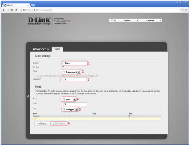 Įveskite VLAN grupės pavadinimą (1), pasirinkite tipą Transparent (2), įveskite VLAN žymę 6 (3), pasirinkite prievadą, prie kurio bus jungiamas GALA priedėlis/televizorius (4), prievado tipą Untagged (5) bei išsaugokite nustatymus (6).