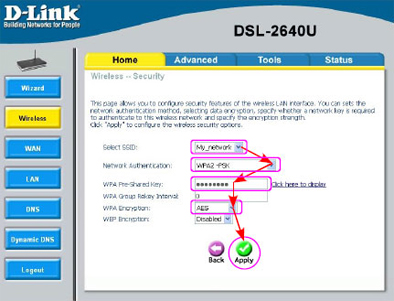 В следующем окне выбираем своё имя сети «My_network» из списка «Select SSID», выбираем тип сетевой аутентификации «Network Authentiсation», например «WPA-2 PSK», вводим ключ (8 – 63 символа) «WPA Pre-Shared Key», выбираем метод шифрования «WPA Encryption», например «AES», и для сохранения внесённых изменений нажимаем кнопку «Apply».