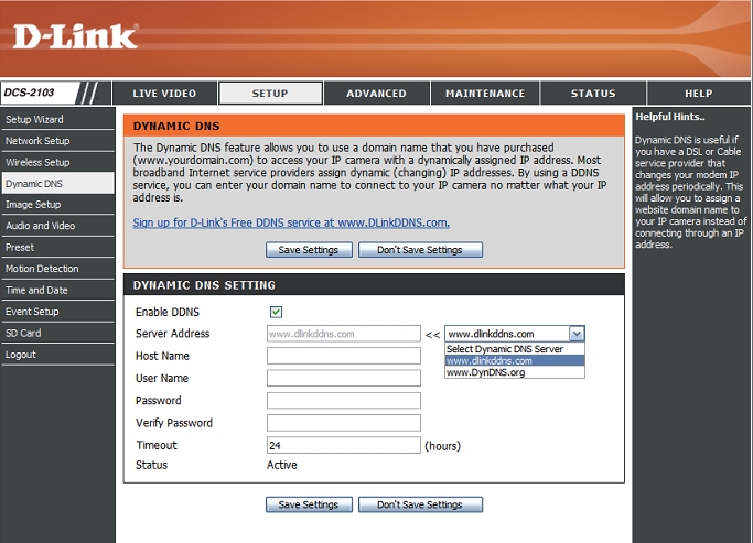 2. Вверху выберите вкладку Setup. Слева выберите пункт Dynamic DNS.