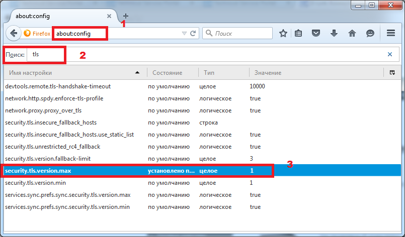3. Сменить значение "security.tls.version.max" на "1"