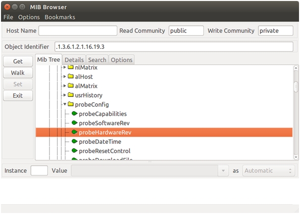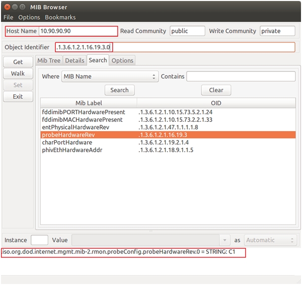 Получить значение по найденному OID можно в самой программе, для этого потребуется ввести ip адрес коммутатора в поле Host Name, добавить “.0” к OID в поле  Object Identifier и нажать кнопку Get (рисунок 6). Полученное значение в нижней части окна программы.