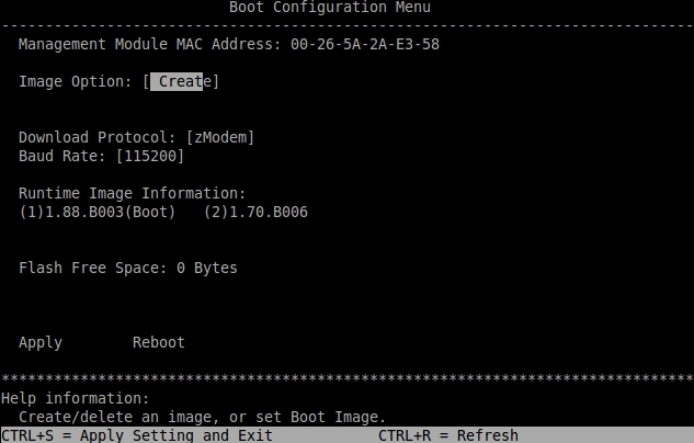 1. При загрузке коммутатора необходить зажать комбинацию клавиш Shift+3. В появившемся окне выбираем Image Option — Create, BaudRate - 115200 и нажимаем Apply.