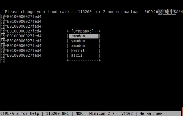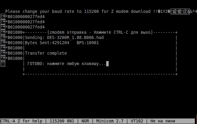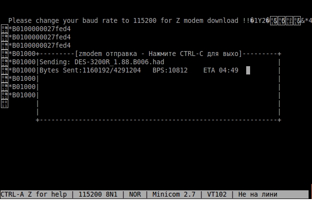 2. Затем запускаем терминал с возможностью отправки файла через Z-Modem, это может быть например Hyperterminal или Minicom, и подключаемся к коммутатору на скорости 115200.