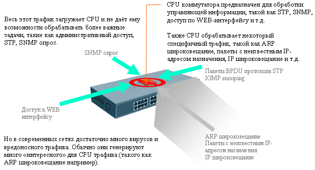 - Преимуществом нестрогого режима exhausted является то, что в нём он не просто отбрасываются все ARP-пакеты или пакеты IP-широковещания, а динамически изменяется полоса пропускания для них. Таким образом даже при серьёзной вирусной эпидемии, коммутатор L2/L3 будет доступен по управлению, а коммутатор L3 сможет обеспечивать взаимодействие между подсетями.