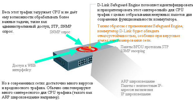 Функция SafeGuard Engine функционирует следующим образом. При превышении загрузкой CPU верхнего предела, коммутатор отбрасывает все ARP пакеты. При значении загрузки между двумя пределами, коммутатор обрабатывает только ARP пакеты, предназначенные ему. При снижении загрузки ниже нижнего предела коммутатор обрабатывает все ARP пакеты.