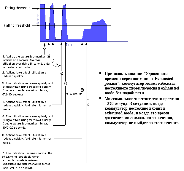 - Если загрузка CPU становится выше порога Rising Threshold, коммутатор войдёт в Exhausted Mode (режим высокой загрузки), для того, чтобы произвести следующие действия (смотрите следующий слайд).