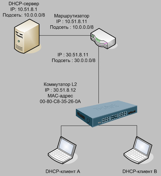- DHCP-сервер использует диапазон адресов 30.51.8.100 - 30.51.8.200 для выдачи DHCP-клиенту, запросы которого перенаправляются агентом DHCP Relay 30.51.8.12 (коммутатор L2)