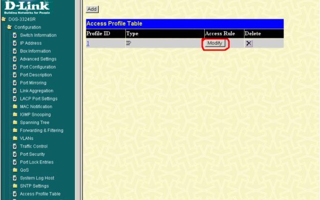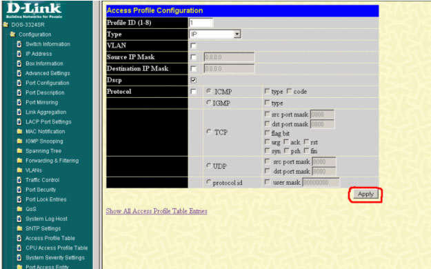 config access_profile profile_id 1 add access_id 20 ip dscp 30 port 24 permit priority 7 replace_priority