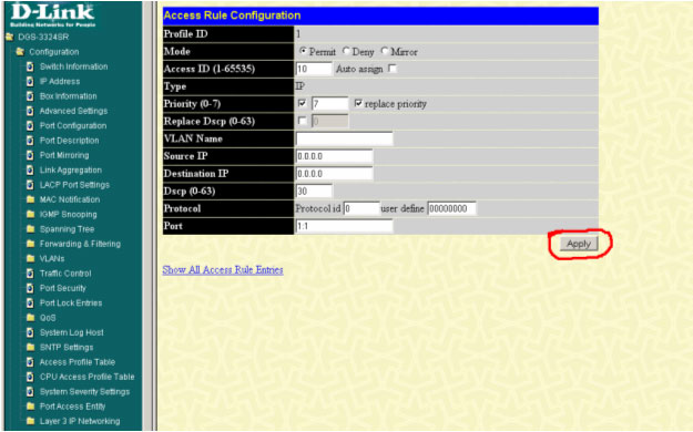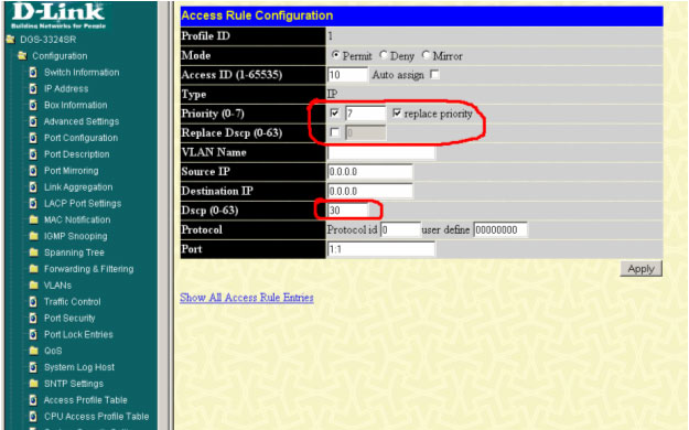 config access_profile profile_id 1 add access_id 10 ip dscp 30 port 1 permit priority 7 replace_priority