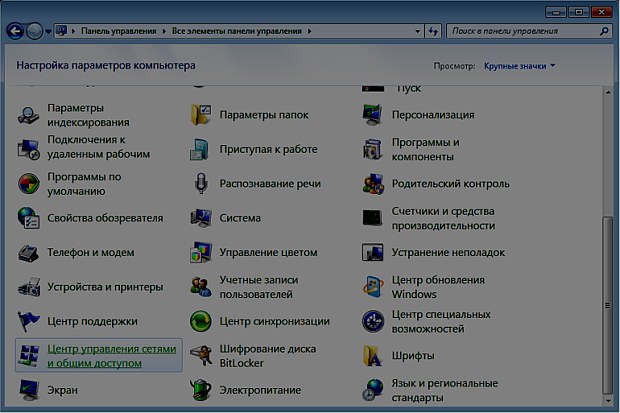 2. Выберите пункт Центр управления сетями и общим доступом. (Если панель управления имеет вид «по категориям» (в верхнем правом углу окна в списке Просмотр выбран пункт Категория), выберите строку Просмотр состояния сети и задач под пунктом Сеть и Интернет.)