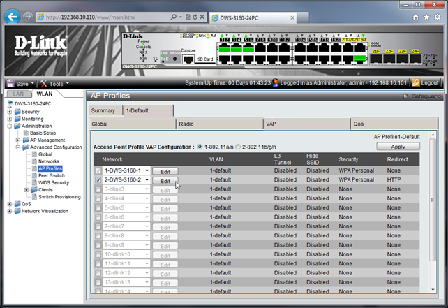 На открывшейся странице в списке имён активных беспроводных сетей (Network) выбираем нужную сеть (в нашем примере – DWS-3160-2) и нажимаем кнопку «Edit».