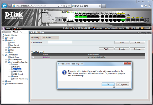 В списке AP Profiles в столбце информации о состоянии изменённого профиля видим его статус «Associated - Modified».