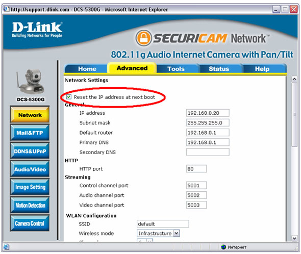 В настройках Интернет-камеры уберите галочку с пункта "Reset the IP address at next boot".