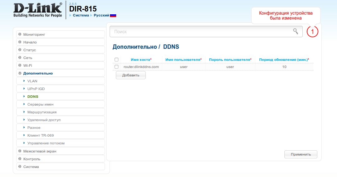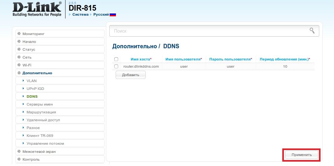 3. Введите необходимые данные, включая имя хоста, имя пользователя, пароль и период обновления, т.е. интервал времени, через который будет происходить проверка соответствия IP-адреса на WAN-интерфейсе устройства и сохраненного на сервисе DDNS. Нажмите Применить.