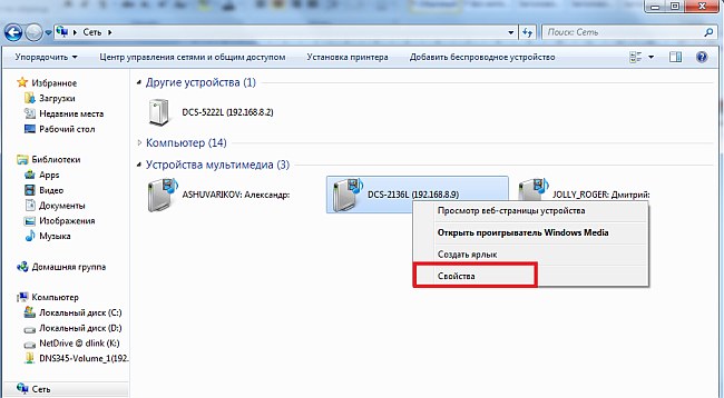 Шаг 3: В разделе Мультимедиа устройства найдите DCS-2136L и нажмите правой кнопкой мыши на значке. Выберите Свойства из всплывающего меню.