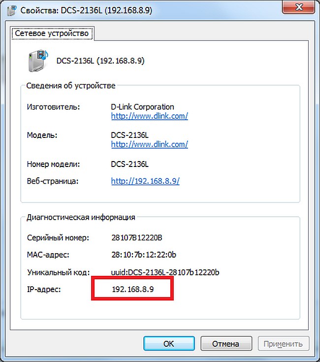 Шаг 4: В нижней части окна Свойства найдите IP-адрес. Это IP-адрес камеры. Запишите этот адрес.