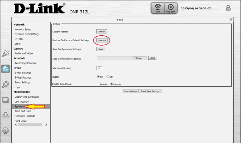 Шаг 6. После обновления рекомендуется сбросить видеорегистратор к заводским настройкам. Для этого в разделе System (Система) нажмите кнопку Restore (Восстановление)