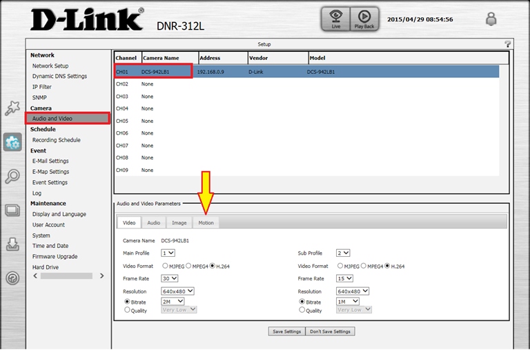 Шаг 4: Перейдите в раздел Audio and Video (Аудио и видео). Справа выберите необходимую камеру, после чего откройте вкладку Motion (Движение)