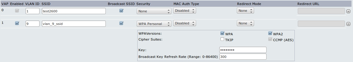 По умолчанию включен только основной SSID (vap0). Меняем его SSID на test2600. VLAN ID оставляем равный единице.