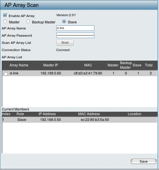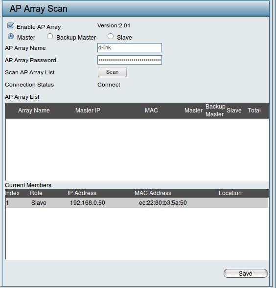 Функция AP Array позволяет централизовано управлять настройками точек доступа: суть в том, что при изменении настроек master-точки на slave-точке настройки изменяются на те же автоматически.