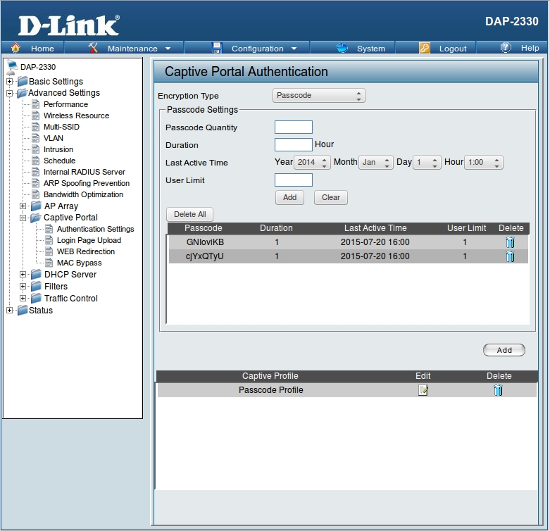 Passcode Quantity – количество паролей, генерируемых точкой (если, например, при настройке указать значение Passcode Quantity равно трем и нажать Add, то будет добавлено 3 пароля).